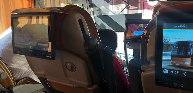 Seat di dalam bas ni adalah 2 + 1. Kami suami isteri duduk seat sebelah2. Setiap seat disediakan sekali skrin untuk entertainment. Antara yang ada ialah bacaan alquran. Kami tak tengok guna sangat skrin ni. Dalam bus ni ada wifi, jadi kami spend masa dengan menonton ceramah berkenaan umrah di youtube saja, dan video call dengan anak2 di rumah.